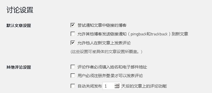 目前WordPress对已经发布的文章并没有集成一键开启关闭评论的功能,只是是否允许在新发布的文章发表评论,或者自动关闭发布多少天前的文章的评论功能。如下图: